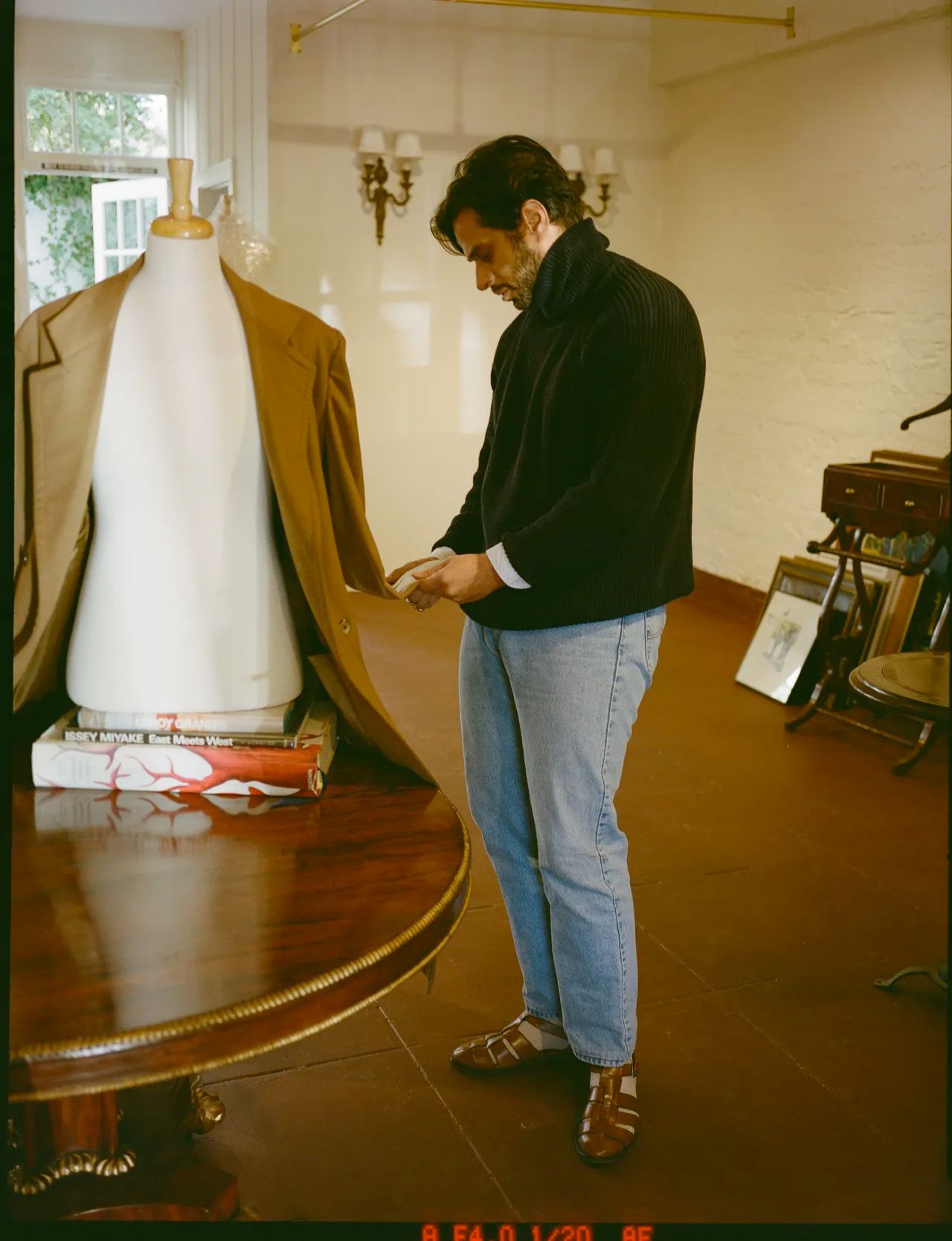 It’s a warm spring afternoon in relatively sleepy Pasadena, clear on the other side of town from LA’s best-known menswear shops, and we’re at what is, for now, the storefront for his brand, Ghiaia Cashmere: a shoebox in an old-fashioned shopping arcade. The space, all 340 square feet of it, is packed to the ceiling with Baroncini’s clothing—primarily sweaters, plus shirts and pants and one extremely handsome pair of fisherman’s sandals. It’s also carefully art-directed, jammed to the gills with hard-wearing, history-rich knickknacks and artifacts and images: coils of nautical rope, ceramic ashtrays, photos of cars and sailboats.