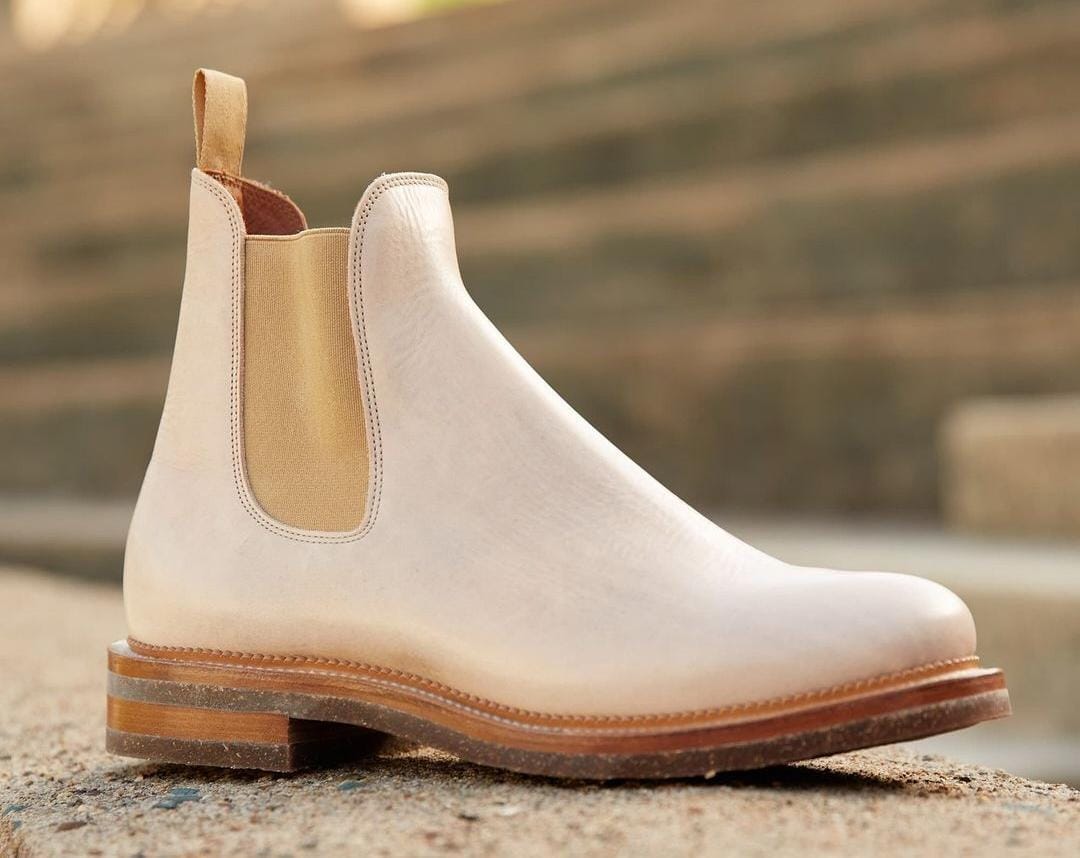 The new Chelsea 2030 Last features a riding boot silhouette with a comfortable fit and military-dress flair. Key features include a sand tan elastic gusset, fabric pull loop, natural leather 360 scalloped storm welt, and the high-traction Lactae Hevea TZAR Crepe Sole.