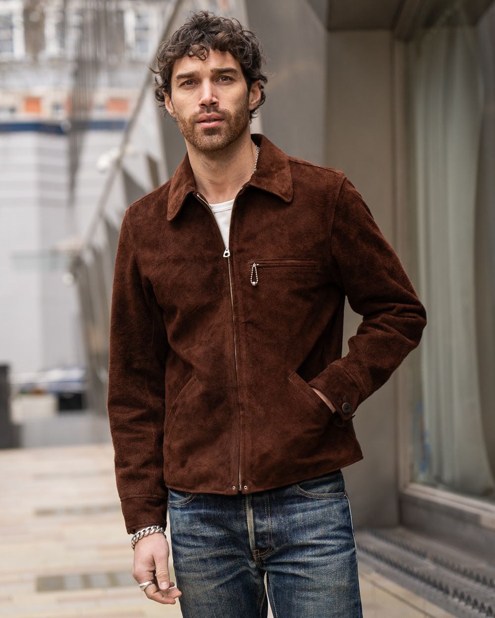 Crafted from 0.8mm-thick French horsehide suede, the jacket is soft but tough, offering immediate comfort and long-lasting durability. The vegetable-tanned leather gives it a unique character that develops over time.