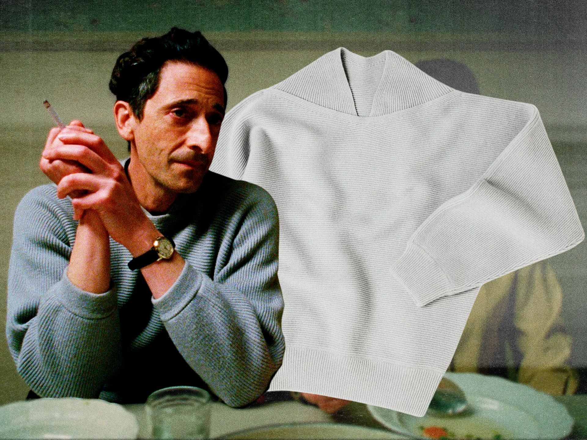 About three-quarters of the way through The Brutalist, Brady Corbett’s Oscar-winning epic about the life of a Hungarian Jewish architect named László Tóth, there’s a scene that has transfixed a certain sector of menswear enthusiasts ever since the film hit theaters last December. In the clip, it’s the late 1950s, and Tóth—who by then is living in New York City and spending time in its downtown beatnik scene—is having dinner with his family at their apartment. Seated at the table, he is wearing a concrete-gray sweater with a sculptural neckline, Issey Miyake-esque ribbing, and soft, sloping shoulders.